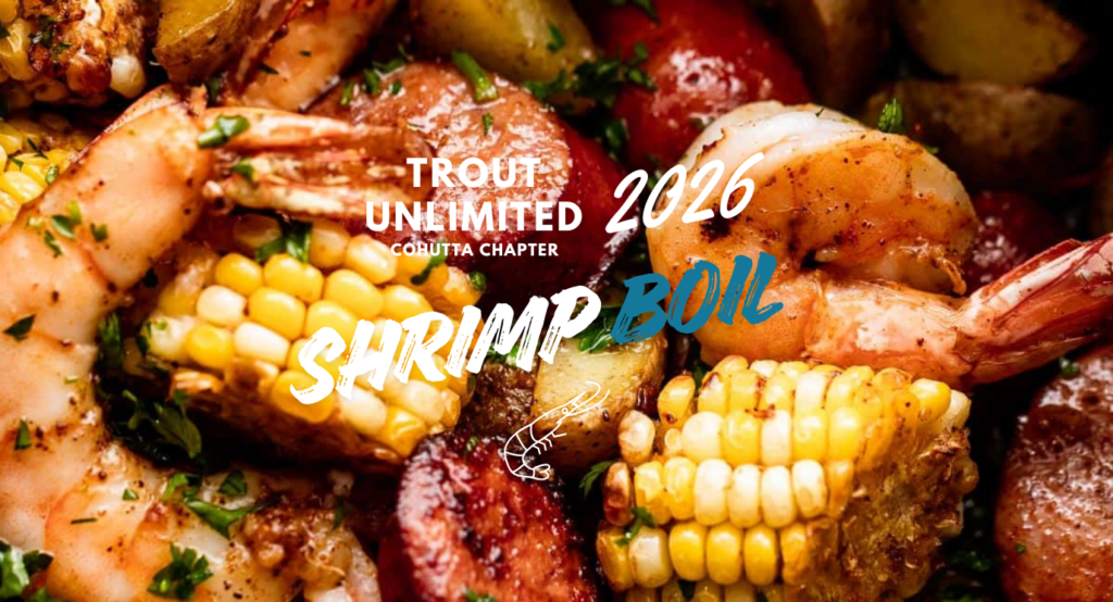 We’re gearing up for an unforgettable afternoon and evening at Trout Unlimited’s 2026 Low Country Boil and annual Shrimp Boil fundraiser on April 18, 2026, from 4:00–8:00 PM at George Washington Carver Park, 3900 Bartow Carver Rd SE, Acworth, GA 30102. Set against the beautiful backdrop of Lake Allatoona—with a large porch lined with rocking chairs overlooking the beach and water—this special event brings together family fun, fly casting lessons, kayak safety demonstrations, and a classic Low Country Boil. Guests will enjoy a delicious spread of fresh seafood including shrimp, crab, and crawfish seasoned with authentic Southern flavors, along with great raffles, silent auction items, and live bluegrass music. More than just a feast, this celebration of community, conservation, and camaraderie is our chapter’s one and only major fundraiser, supporting impactful programs such as Trout in the Classroom, Veterans and First Responders Fly Fishing Classes, the Five Rivers Program, and Casting for Recovery. Please mark your calendar, bring a friend, and join us for a memorable event that delights the senses while advancing the vital mission of conserving coldwater fisheries and their watersheds. Ticket fee of $25 dollars covers the great social atmosphere, music and food. Raffle tickets will be available to purchase for a chance to win some awesome prizes. Be sure to stop by our silent auction for a shot at some items sure to be the envy of all your friends! Come early to get in on the casting lessons and kayak safety.